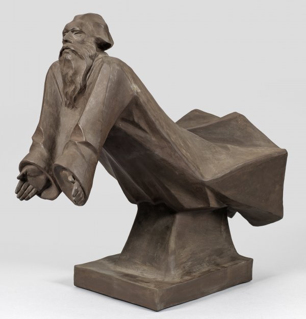 "Schwebender Gottvater". Originaltitel Böttgersteinzeug. Auf rechteckiger Plinthe mit hochgezogener Stütze schwebender Gottvater in langem Gewand mit ausgestreckten Armen. Entw. Ernst Barlach, um 1922. Modell-Nr. 85034. Entw.-Bez.; Schwertermarke. H. 52 cm. 51 cm x 33 cm.