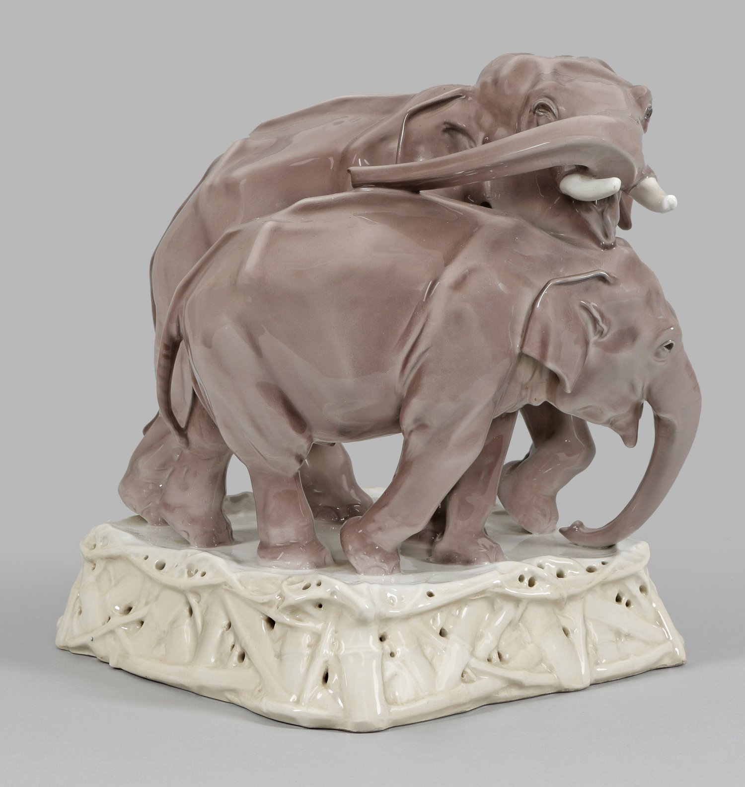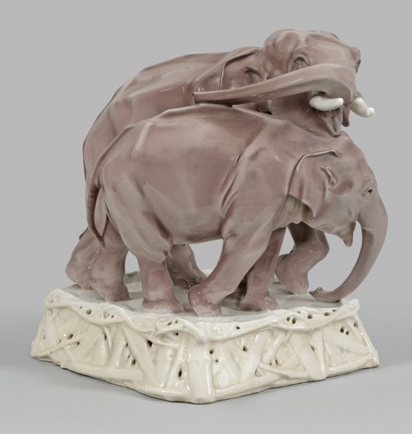Große Elefantengruppe Auf reliefiertem, durchbrochen gearbeitetem Bambussockel dynamisch bewegte, vollplastische Darstellung von zwei Elefanten beim Spiel. Unterglasurmalerei in beige- und auberginefarbenen Tönen. Figur-Entw. Anton Puchegger, 1909. Modell-Nr. 9158 A. Dekor-Nr.140/338 mit "PF". Jahreszeichen. Minim. rest.; Zeptermarke. H. 37 cm. 30 cm x 30 cm.