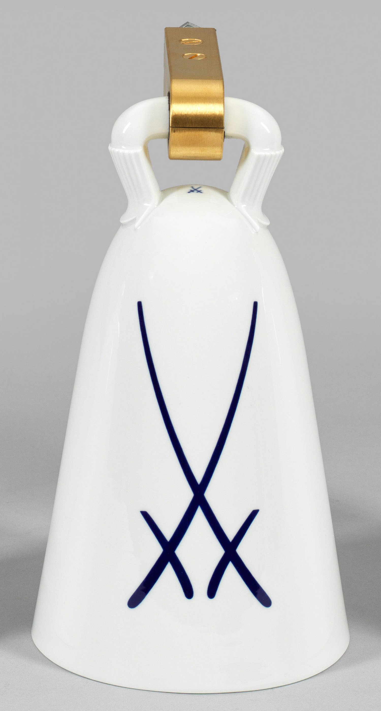 A large porcelain bell with "crossed swords" motif after the carillon of the Meissen Frauenkirche. Crossed swords mark.