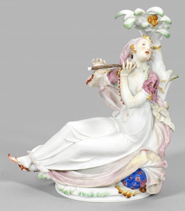 Orientalin mit Flöte Auf ovalem Sockel an einer stilisierten Palme sitzende lauschende Orientalin mit Querflöte. Polychrome weichtonige Malerei mit wenig Gold. Entw. Paul Scheurich 1922/23. Modell-Nr. 67072. Schwertermarke. H. 22 cm. 19 cm x 12 cm.