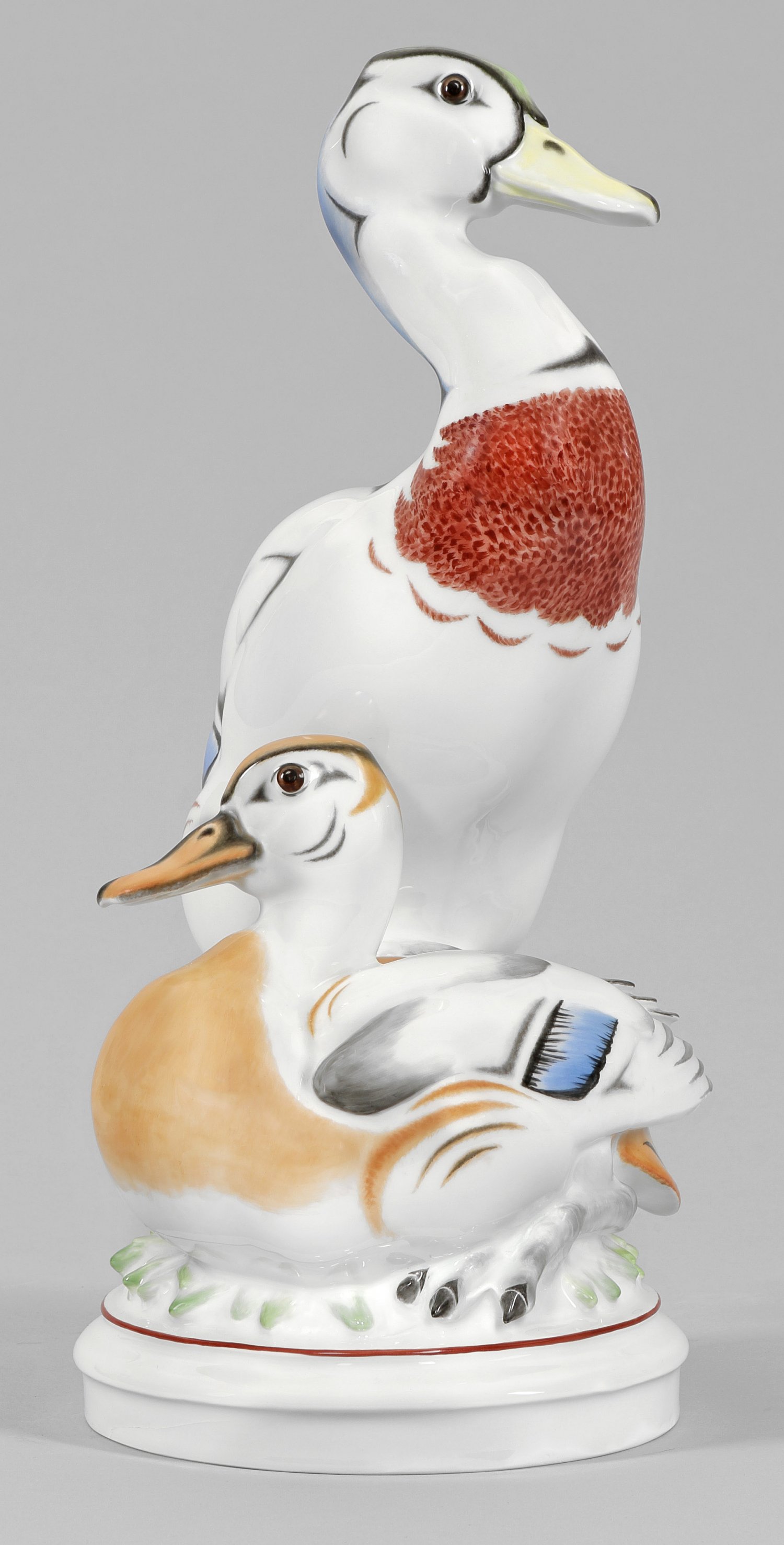 Große Figurengruppe "Zwei Wildenten". Originaltitel Runder, profilierter Sockel. Über stilisiertem Grasterrain aufrecht stehende bzw. hockende Wildente. Polychrome, akzentuierte Aufglasurmalerei in leuchtenden, kräftigen Farben in Art Déco-Manier. Entw. Max Esser, 1938. Modell-Nr. A 1298. Produktionsbedingter Riss unter der Glasur. Schwertermarke. H. 52 cm.