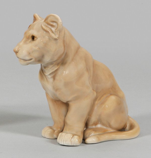 Löwenjunges am Boden sitzend. Unterglasurmalerei in hellen Brauntönen mit wenig Schwarz. Modell-Nr. 1923. Manufakturmarke. H. 15 cm.
