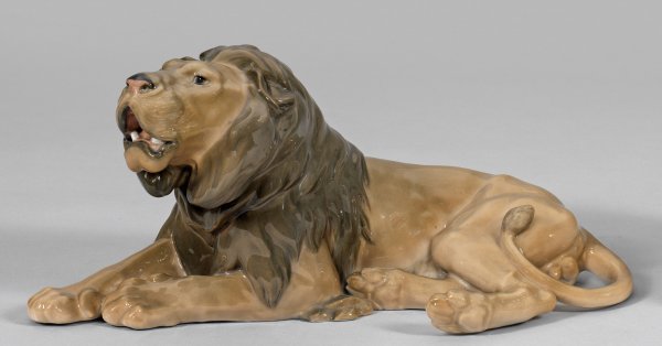 Liegender Löwe mit geöffnetem Maul in naturalistischer Ausführung. Grau-bräunliche, in Rot- und Blautönen akzentuierte Unterglasurmalerei. Entw. Lauritz Jensen. Entw.-Bez.; Modell-Nr. 1268. Manufakturmarke. H. 16 cm. 35 cm x 16 cm.
