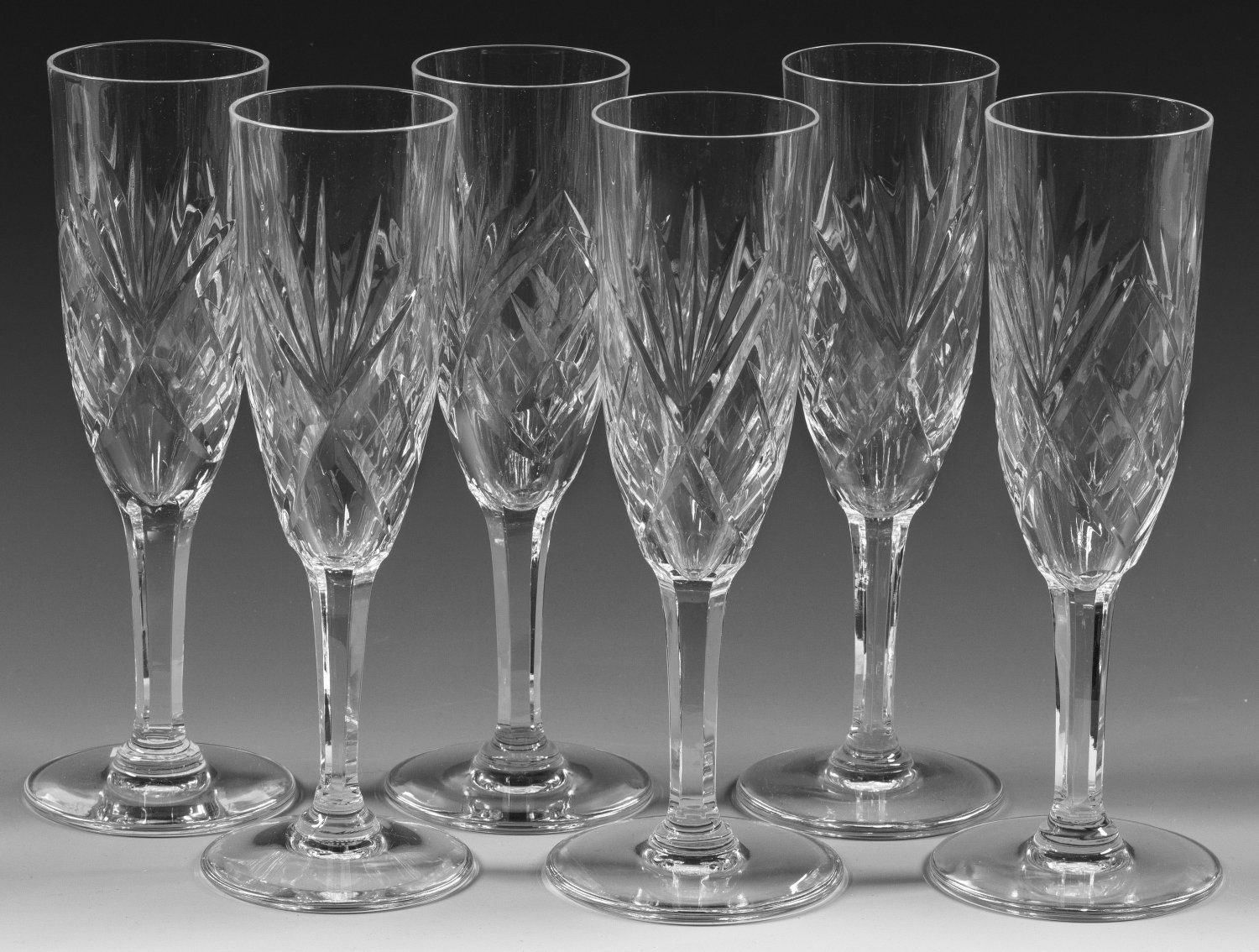 Satz von sechs Saint-Louis-Champagnerflöten "Chantilly" Farbloses Kristallglas, geschliffen. Flacher Scheibenfuß, Stiel facettiert, die Kuppa mit ornamentalem Schliffdekor. Ein Glas mit Firmen-Ätzstempel. H. 18,7 cm.