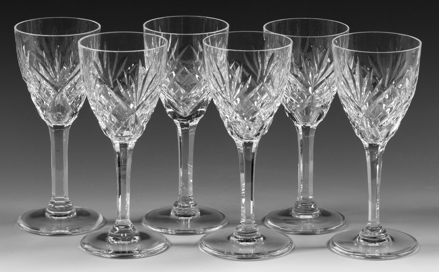 Satz von sechs Saint-Louis-Sherrygläsern "Chantilly" Farbloses Kristallglas, geschliffen. Flacher Scheibenfuß, Stiel facettiert, die ovoide Kuppa mit ornamentalem Schliffdekor. Firmen-Ätzstempel. H. 15,3 cm.