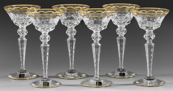 A set of six cut and gilt French Saint-Louis "Excellence" champagne saucers (coupes). Four glasses with factory labels.