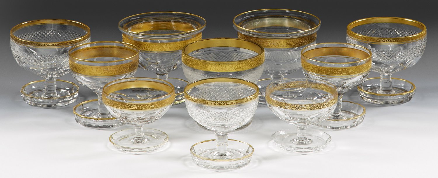 A collection of ten Moser footed crystal glass bowls or caviar bowls with cut, acid-etched and gilt decor. Accompanied by two inset glass bowls for caviar.