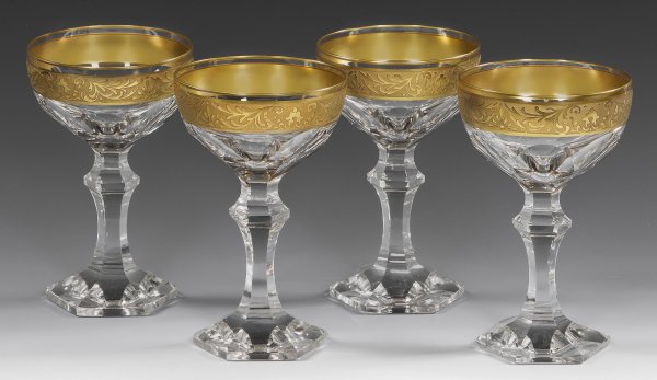 Four Bohemian cut crystal glass champagne goblets with acid-etched and gilt decor by Moser or Oertel.