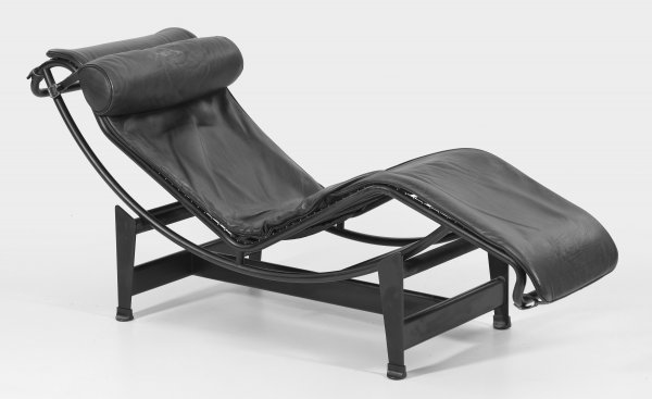 LC4-Liege von Le Corbusier Metall schwarz lackiert sowie schwarzes Leder. Liegefläche aus gebogten und gekanteten Rundstäben mit flacher Polsterauflage und Nackenrolle lose auf einem Gestell aus breiten Streben aufliegend. Herstellerzeichen Seriennummer 32923 sowie geritzte Künstlersignatur. Entw. Le Corbusier Pierre Jeanneret und Charlotte Perriand 1928. H. Ca. 72 cm. 160 cm x 56 cm.