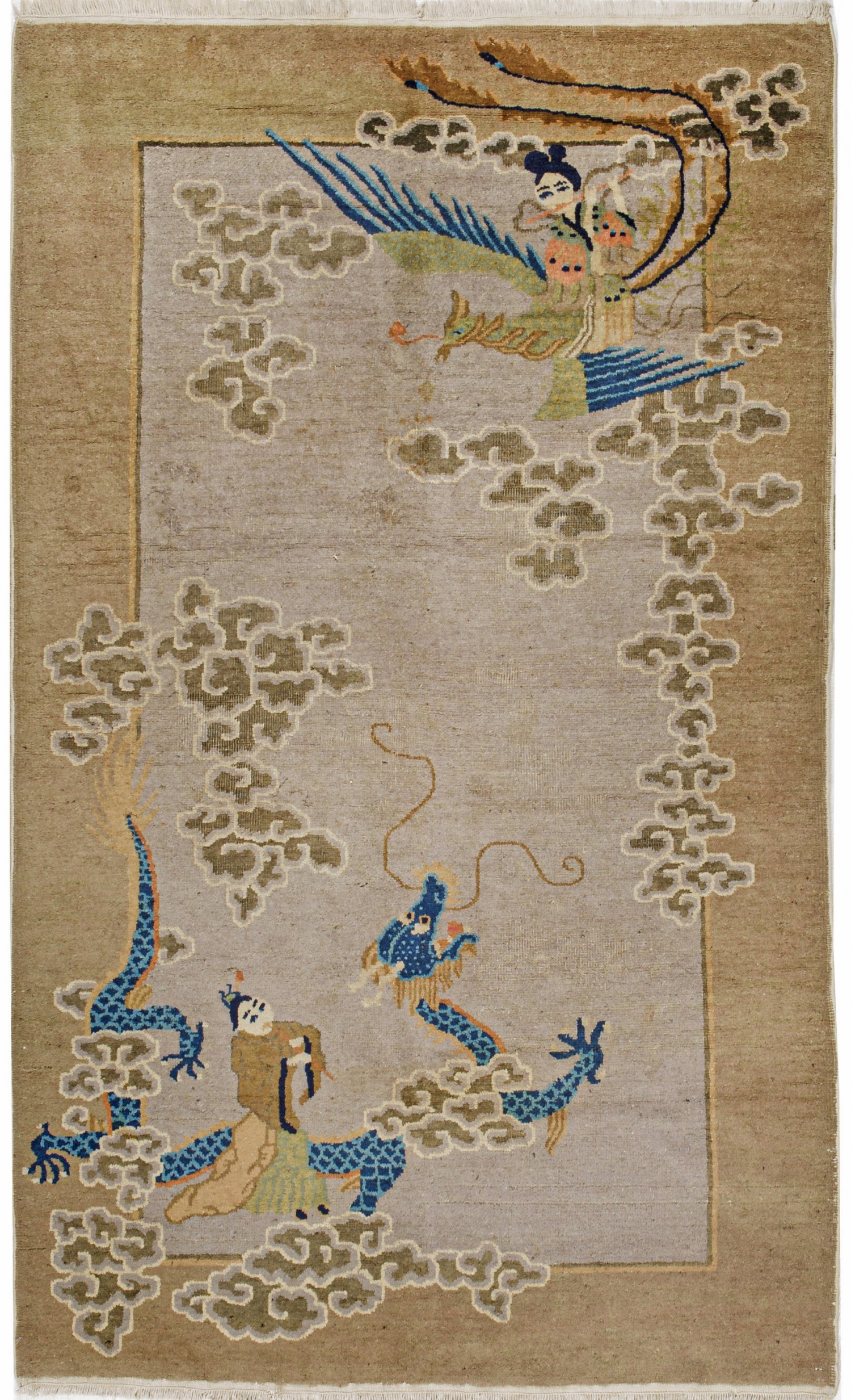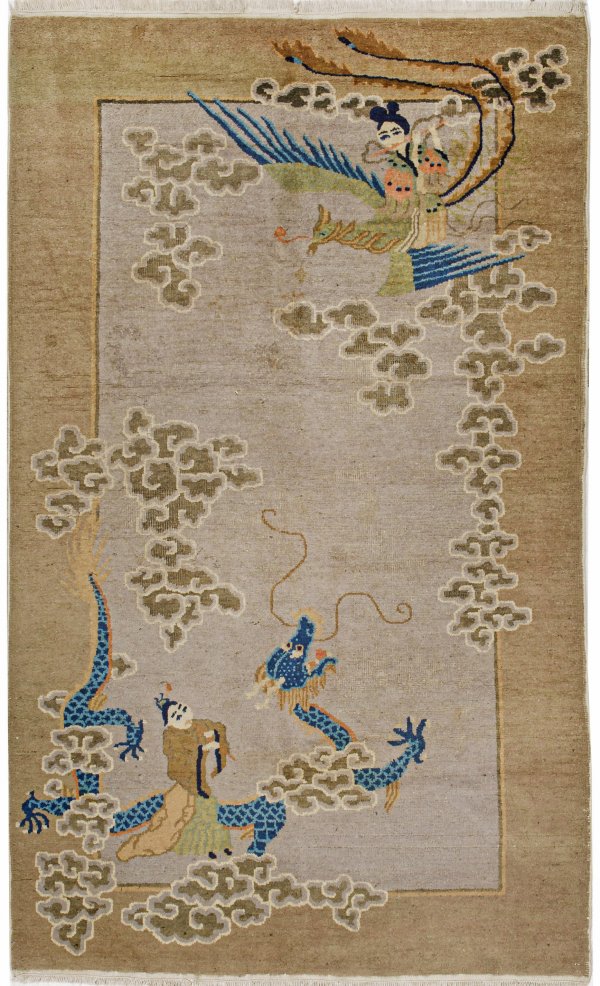 Alte Peking-Brücke China. Peking. Um 1930. Wolle auf Baumwolle. Hellgraues monochromes Innenfeld sowie breite beigefarbene Bordüre. Musterung aus üppigen Wolkenmotiven fünf-klauigem Drachen Phönix und Figuren. 127 cm x 210 cm.