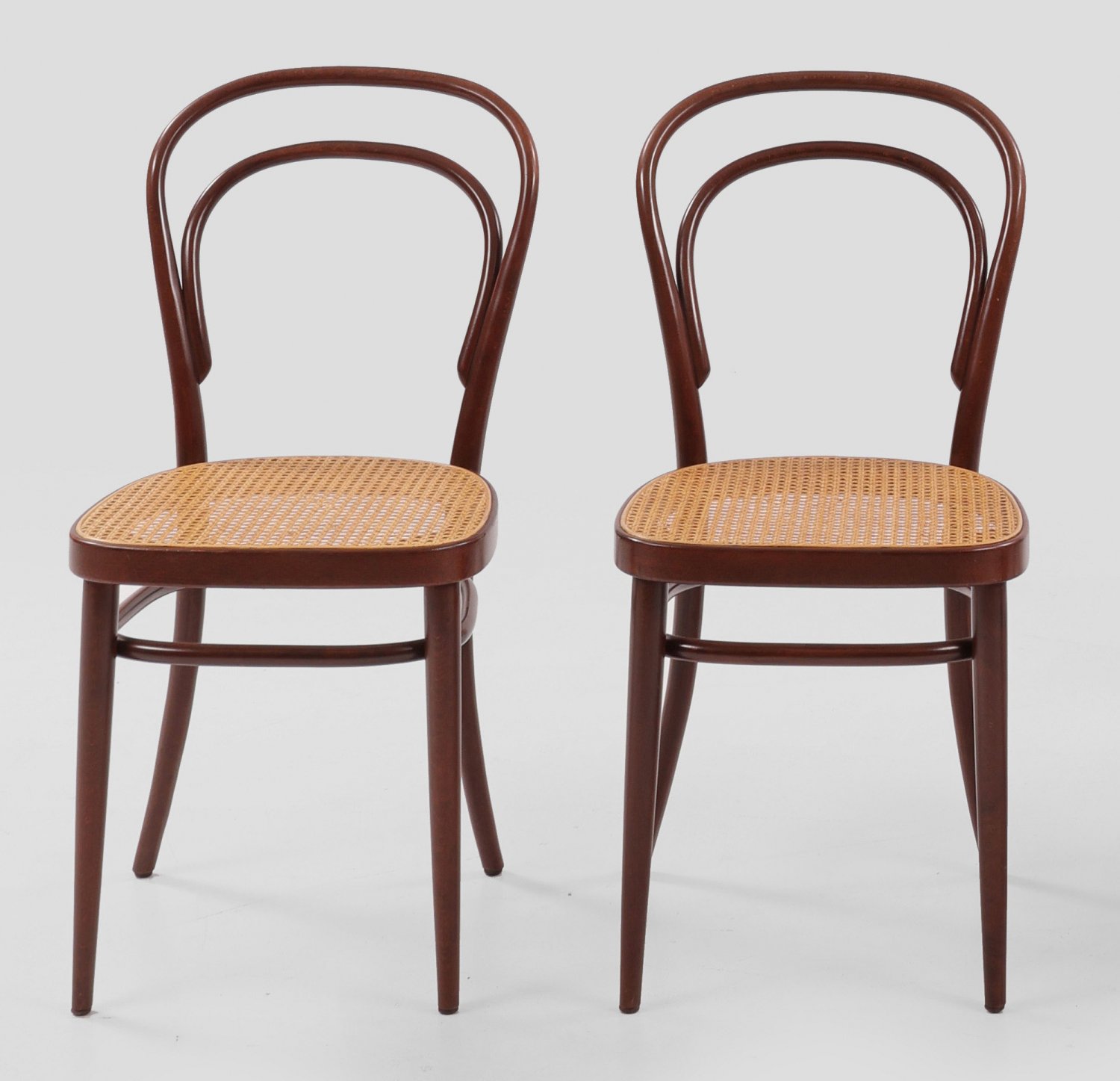 Paar Caféhaus-Stühle von Thonet Modell 214. Buchenholz rotbraun gebeizt. Gestell aus gebogten Rundstäben sowie Sitzfläche aus Rohrgeflecht. Schlagstempel Thonet 82 sowie Papieretikett. Entw. Michael Thonet 1859. Sitz-H. 46 cm.