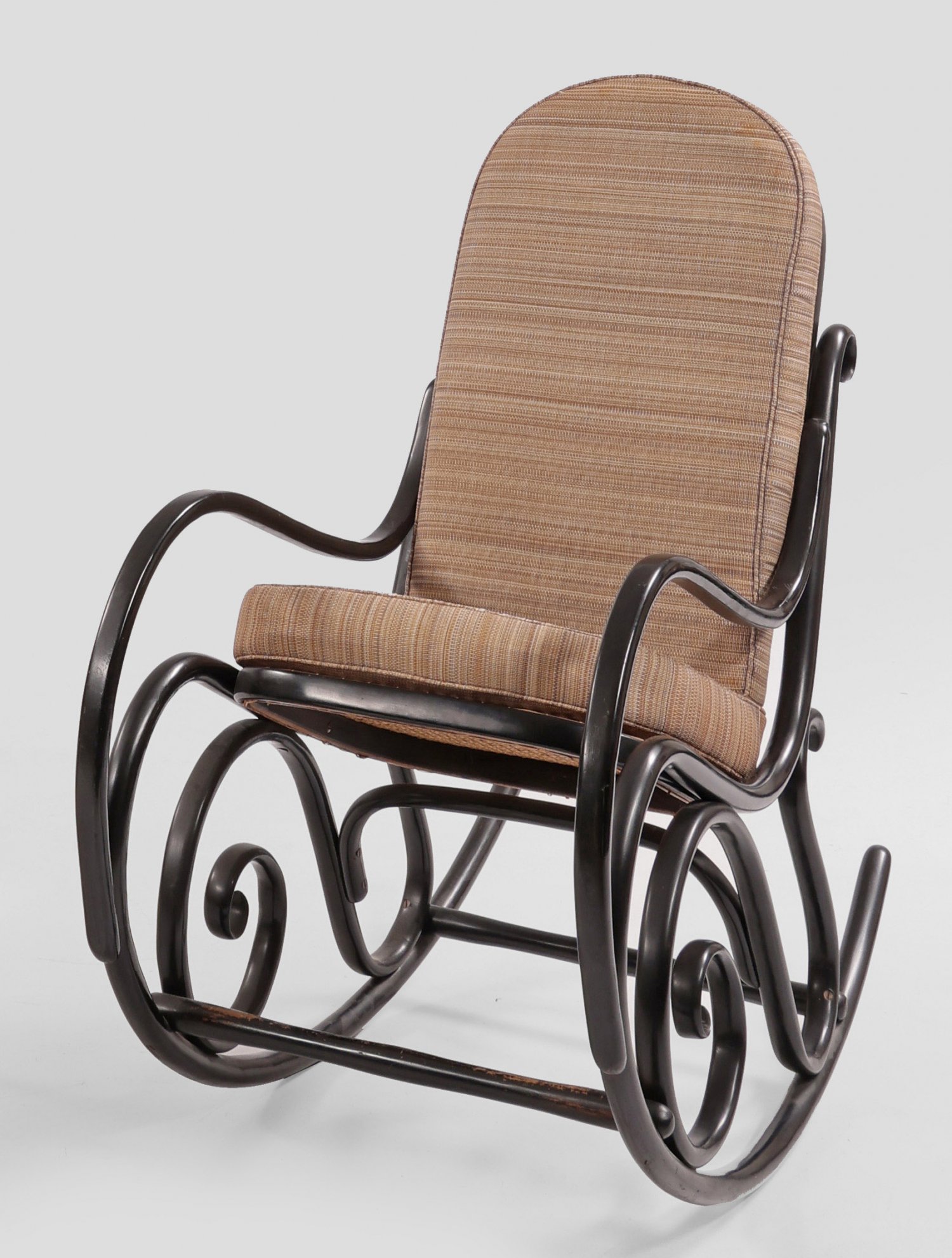 Bugholz Schaukelstuhl Buchenholz schwarz lackiert. Gestell aus stark gebogten teilw. volutenförmig angelegten Rundstäben. Sitzfläche und Lehne aus Rohrgeflecht sowie lose Polsterauflage mit Rosshaarbezug. Unbez. H. 102 cm. 104 cm x 52 cm. Sitz-H.38 cm.