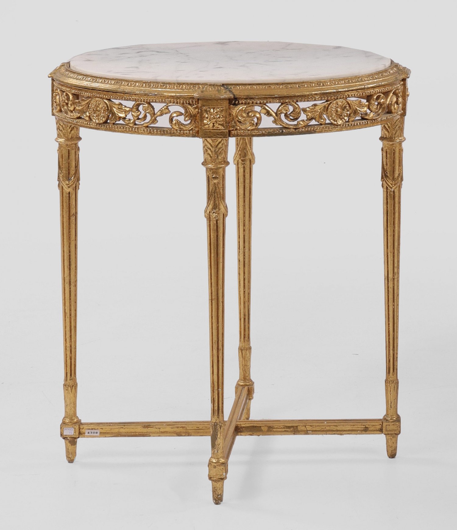 Beistelltisch im Louis XVI-Stil Holz geschnitzt gefasst und vergoldet. Bombierte durchbrochen gearbeitete Zarge aus eingerollten Voluten auf schlanken kannelierten Balusterbeinen unterhalb durch schmale Stege verbunden. Profilgerahmte ovale Deckplatte aus weißem hellgrau gemasertem Marmor. H. 73 cm. 65 cm x 50 cm.
