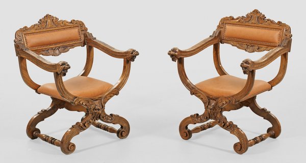 Paar Renaissance-Armlehnstühle Nussbaum teilw. reliefplastisch geschnitzt. Scherenartiges Gestell aus eingerollten Voluten mit reliefiertem Maskaron durch Balusterstäbe verbunden. Geschweift ansteigende Armlehnen mit Löwenköpfen sowie breite Rückenlehnenrahmung mit Bekrönung aus Blattvoluten. Sitzfläche und Lehne gepolstert und bezogen. H. 77 cm. 57 cm x 55 cm. Sitz-H. 36 cm.