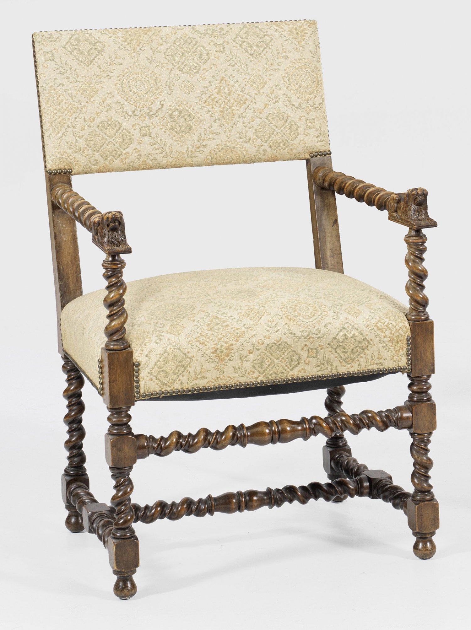 Kleiner Hallensessel Nussbaum teilw. geschnitzt. Gerade Zarge auf gedrehten Balusterbeinen durch entsprechende Stege verbunden. Korrespondierende Stützen für schmale Armlehnen mit vollplastisch gestalteten Löwen. Rechteckige Rückenlehnenrahmung. Gepolstert und bezogen. H. 93 cm. 59 cm x 53 cm. Sitz-H. 49 cm.
