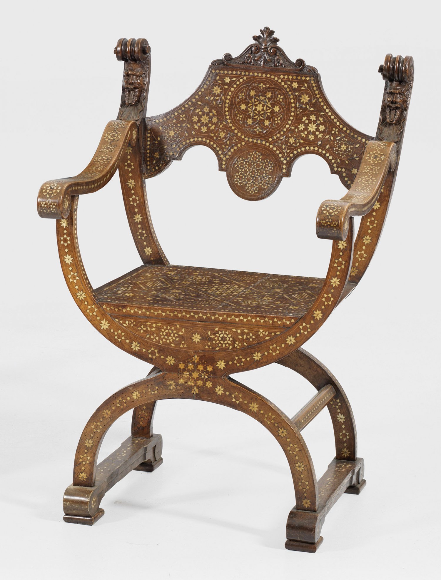Renaissance-Armlehnstuhl Nussbaum massiv und teilw. reliefplastisch geschnitzt sowie reiche Marketerie aus Bein. Offen gestaltetes Gestell aus scherenförmig angeordneten geschweiften Streben mit flacher Sitzfläche. Geschweift ansteigende Armlehnen. Brettartige Rückenlehne flankiert von reliefierten Maskarons. Mosaikartig angelegter Ornamentdekor. H. 92 cm. 52 cm x 53 cm. Sitz-H. 44 cm.