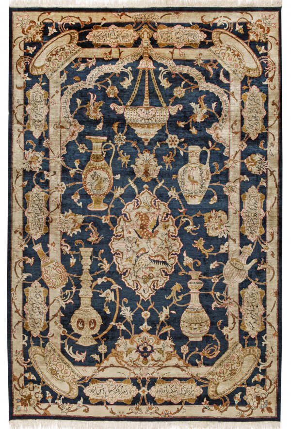 Signierter Seidenteppich Persien. Seide auf Seide. Feine Knüpfung. Auf blauem Fond stilisierte Nische sowie Ovalmedaillon mit Vogeldekor, große Vasenmotive und Ampel in Beige- und Cremetönen. Musterung aus großzügigen Arabesken. Umlaufend breite, korrespondierende Bordüre mit großen Kalligrafie-Reserven aus Gedichtversen von Hafis. Sign.; 144 cm x 211 cm.