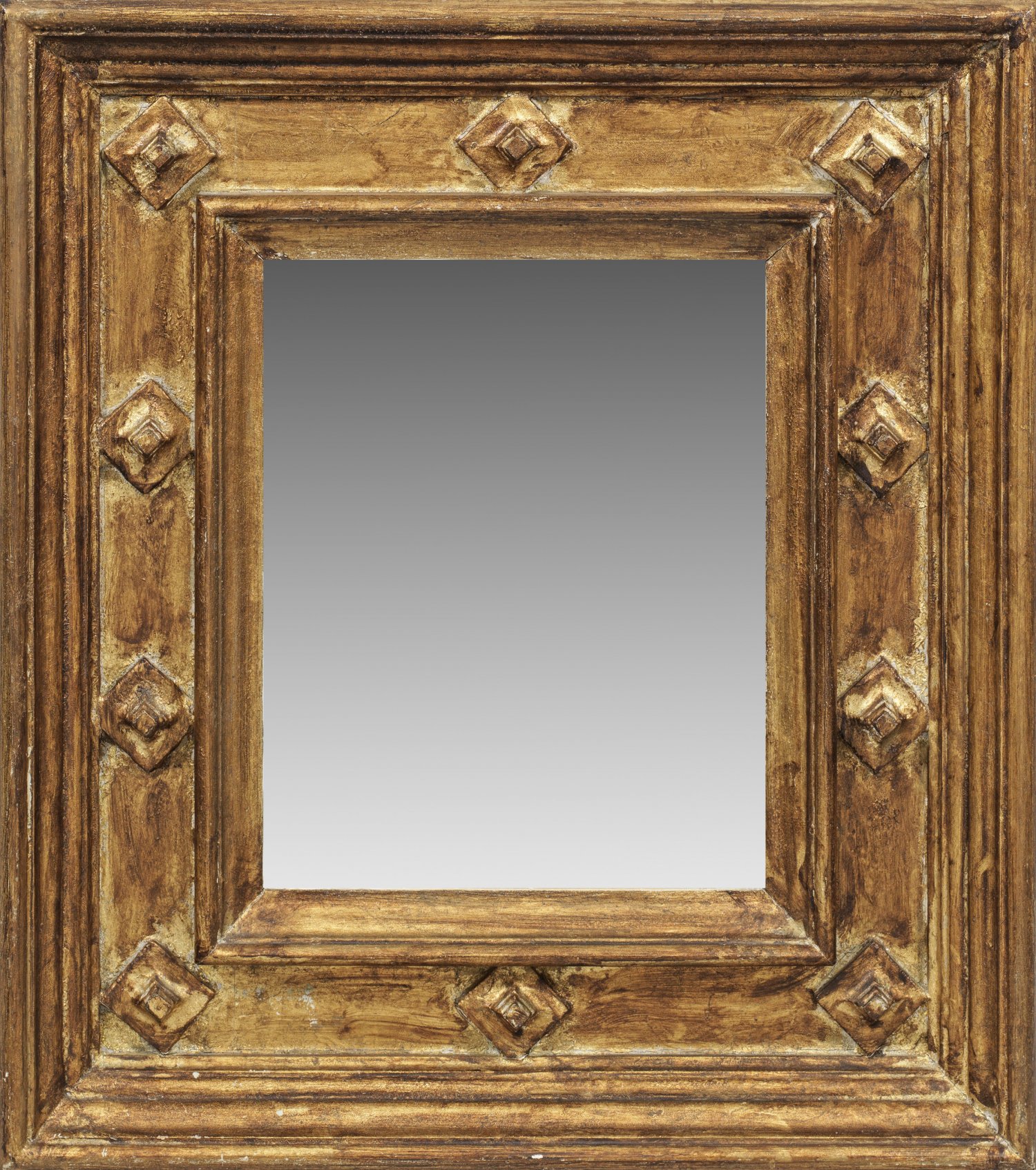 Kleiner Wandspiegel Holz gefasst und vergoldet. Breite profilierte Spiegelrahmung mit Rautenmotiven. 51 cm x 45 cm.