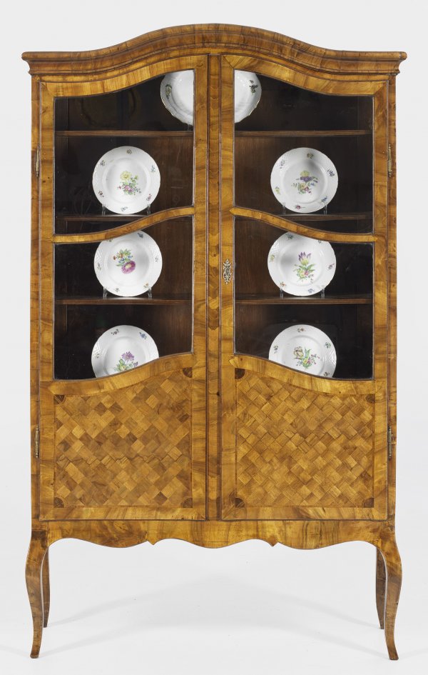 Louis XV-Vitrinenschrank Nussbaum furniert. Gerader hochrechteckiger Korpus mit passig geschweifter Zarge und hohen leicht geschwungenen Beinen. In der gegliederten Front zwei sprossenverglaste Vitrinentüren. Umlaufend gekehltes mittig aufgeworfenes Gesims. Flächendeckend breit gerahmte Furnierfelder aus Rautenmarketerie. H. 191 cm. 115 cm x 34 cm.