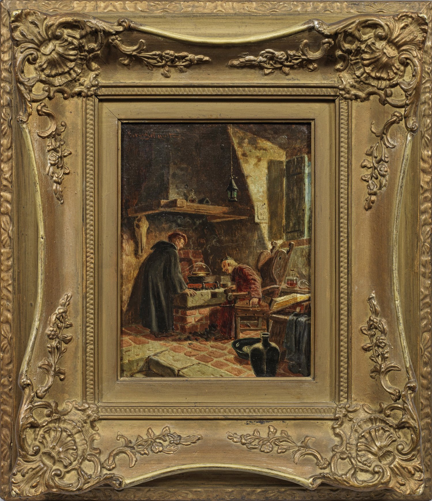 Alchemist und Geistlicher bei einem Experiment am Feuer