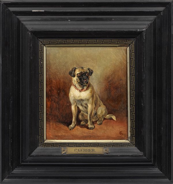 Lebendige Schilderung des auf Hunde spezialisierten Tiermalers, der sich 1860-1866 an den Akademie-Ausstellungen in Berlin beteiligte. Öl/Holztafel. R. u. Ligatur-Monogr.; 19 cm x 16,7 cm. Original-Rahmen.