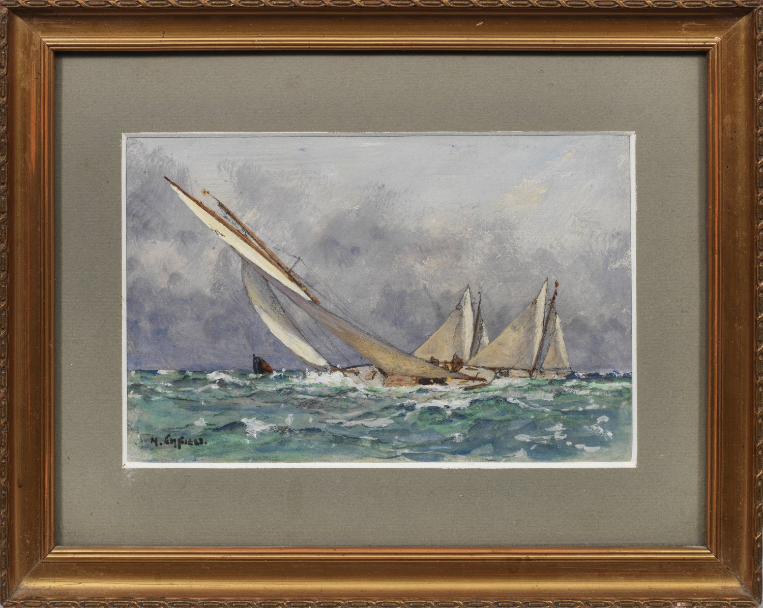 Der Marinemaler beschickte 1899-1914 öfter die Grossen Berliner Kunstausstellungen. Gouache/Papier. L. u. sign.; Ca. 15 cm x 23,5 cm (Passepartoutausschnitt). Rahmen.