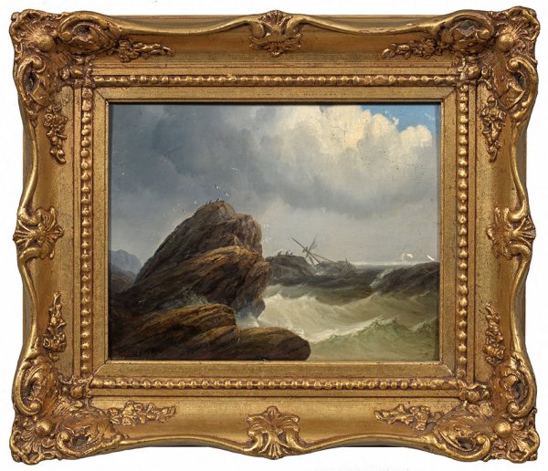 Bei hohem Seegang hat sich ein havariertes Segelschiff zwischen Klippen auf die Seite gelegt, während die Besatzung von einem Felsen aus einem in der ferne nahenden Schiff winkt. Dramatische Schilderung von Wolken und smaragdfarbenen Wellen. Öl/Holztafel. L. u. sign.; 20,5 cm x 27 cm. Rahmen.