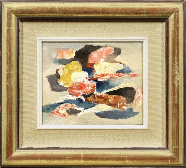 1949 entstandene, von Willi Baumeister beeinflusste Arbeit. Öl/Hartfaser. Verso sign. u. dat. 1949; Etikett mit Bez. "Nachlass Rudolf Muchow Katalog Nr. 77B11". 17 cm x 21,5 cm. Rahmen.