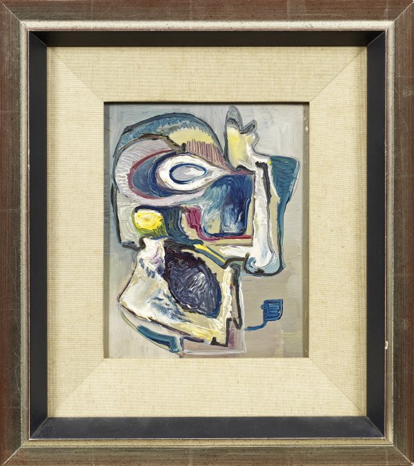 Um 1949 entstandene, von Willi Baumeister beeinflusste Arbeit. Öl/Hartfaser. Verso undeutl. sign.; Etikett mit Bez. "Nachlass Rudolf Muchow Katalog Nr. (...)". 21,5 cm x 17 cm. Rahmen.