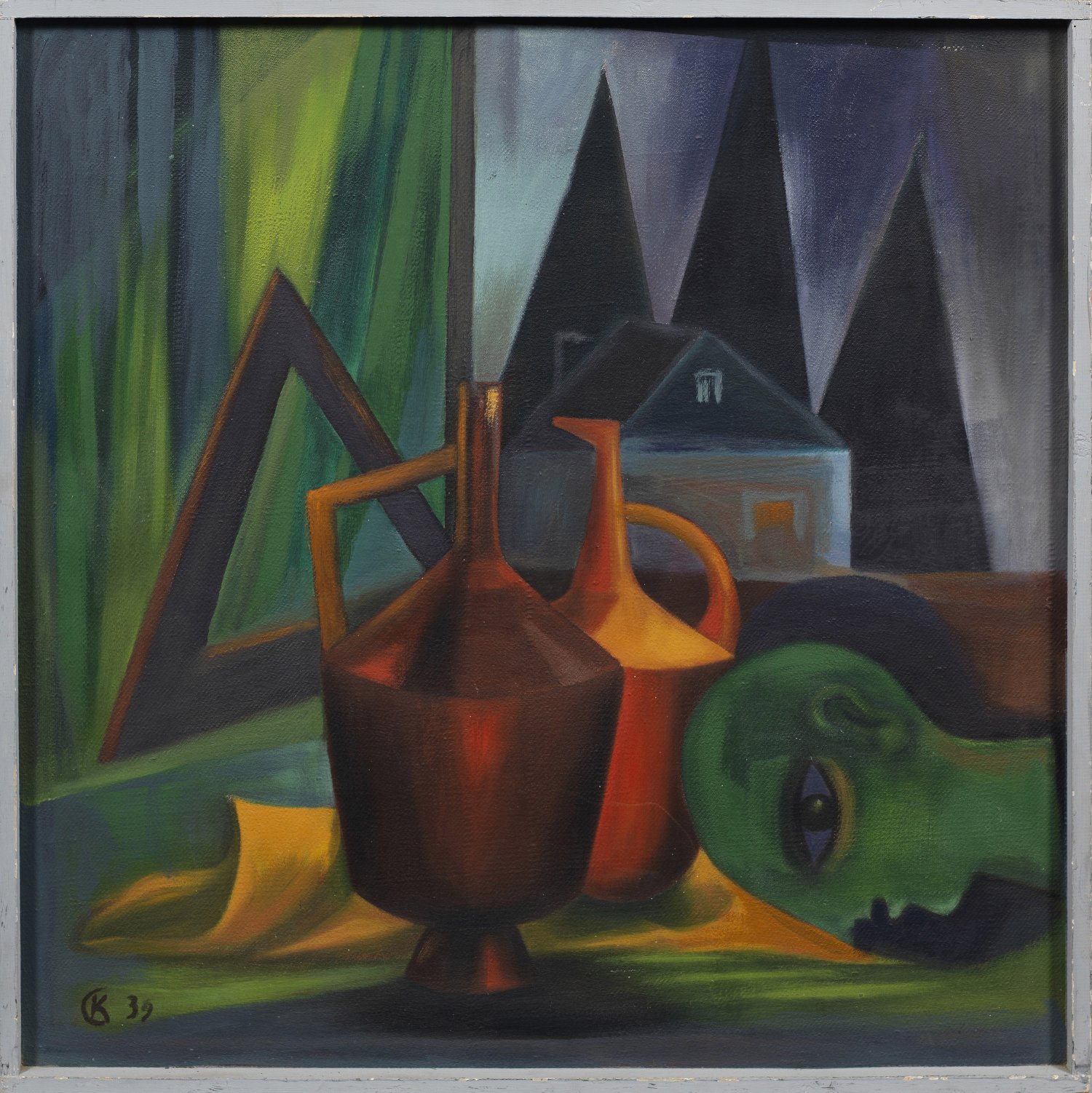 Frühes, 1939 entstandenes, für die Zeit außergewöhnliches kubistisches Werk, geschaffen während ihres Malereistudiums an der Hochschule der Künste in Berlin. Mit ihrer Freundin Cato Bontjes van Beek gehörte sie zur Widerstands-Gruppe "Rote Kapelle", konnte jedoch einer Hinrichtung entfliehen. Öl/Hartfaser. L. u. Ligatur-Monogr. "CK" (=Katja Casella) u. dat. (19)39. Verso nochmals sign. unter ihrem Mädchennamen Katja Casella u. dat. (19)39; Nachlass-Stempel. 79 cm x 79 cm. Rahmen-/Atelierleiste.