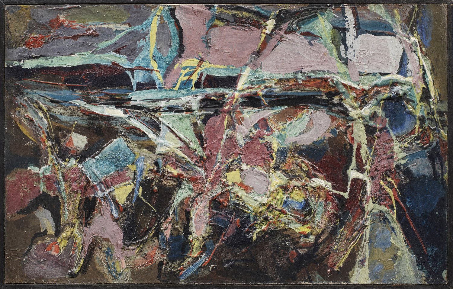 In den 1950er Jahren entstandene Arbeit Schulz-Ihlefelds der an der Kunstakademie in Berlin-Charlottenburg und in der Städelschule in Frankfurt ausgebildet wurde und sich nach 1945 der Abstraktion und dem Informel zuwandte. Mischtechnik (Öl u. Sand)/Malkarton. 25 cm x 40 cm. Rahmenleiste.