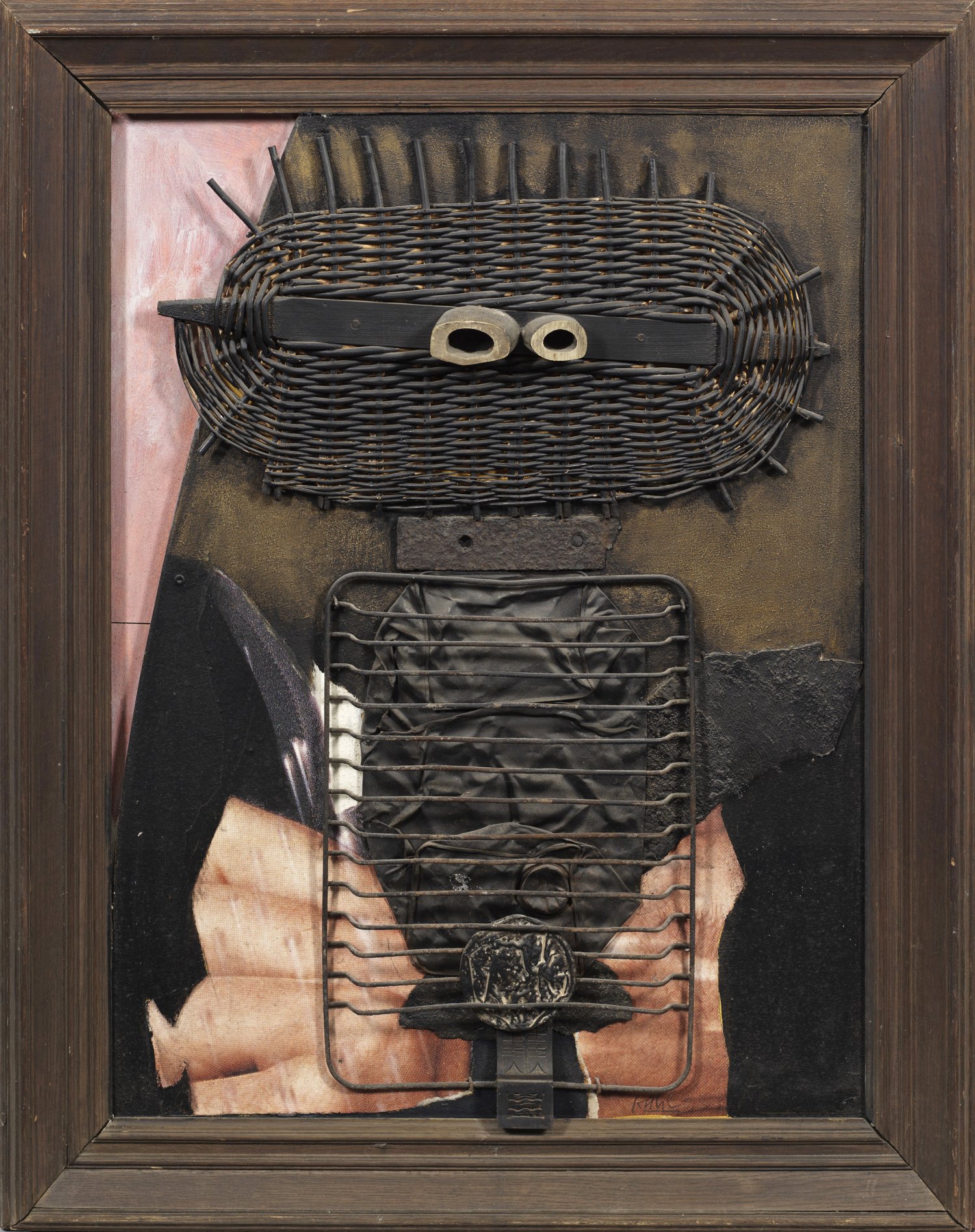 Für Kühl charakteristische Collage aus Fundstücken, die er zu einer archaischen menschlichen Figur zusammenfügte und die sein künstlerisches Prinzip - "Kunst ist Fundsache" zum Ausdruck bringt. Metallelemente, Korb, Knochen, Holz und andere Materialien auf bemalten Holzplatten. R. u. sign.; Verso vom Künstler betitelt, bez. u. dat. 1989 mit diversen Annotationen. 89,5 cm x 69 cm. Rahmen.