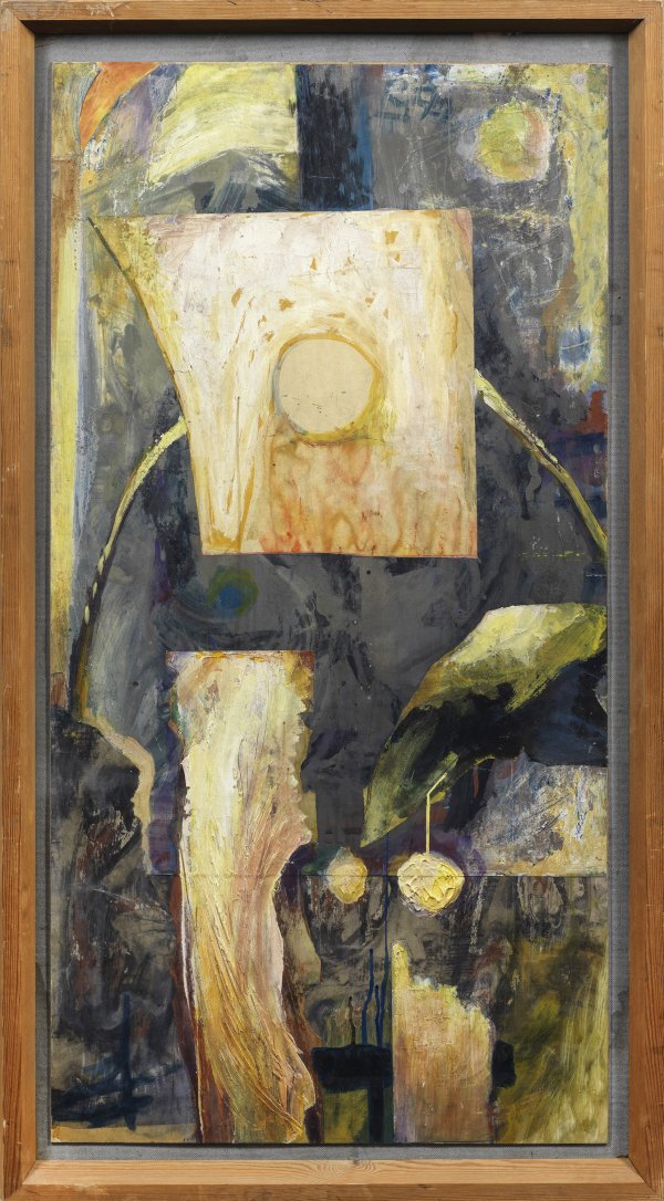 Für Lympasik charakteristische, informelle Mischtechnik- und Collage-Arbeit. Der Künstler studierte an der Berliner Kunstakademie, erhielt 1951 den Kunstpreis der Stadt Berlin und war als Mitglied des Deutschen Künstlerbundes ab den 1950er Jahren vielfach auf dessen Ausstellungen vertreten. Mischtechnik (Öl, Tempera u. Collage)/Papier, original auf Hartfaser kaschiert und auf zweite Hartfaserplatte montiert. Verso vom Künstler bez. u. betitelt. Darstellung ca. 127,5 cm x 67,5 cm. Künstler-Rahmen.