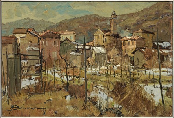 Spätimpressionistische, winterliche Ansicht eines Bergdorfes in Veltlin (Valtellina). Bonanomi wurde vor allem durch seine Landschaften aus Norditalien bekannt, bei denen er die Reize der in die raue Natur eingebetteten, einsamen Dörfer, Landhäuser und Bauernhöfe wiederentdeckte, für welche die Zeit seit dem 19. Jh. stehengeblieben zu sein schien. Öl/Hartfaser. L. u. sign.; Verso betitelt. 40 cm x 59,5 cm. Rahmen.