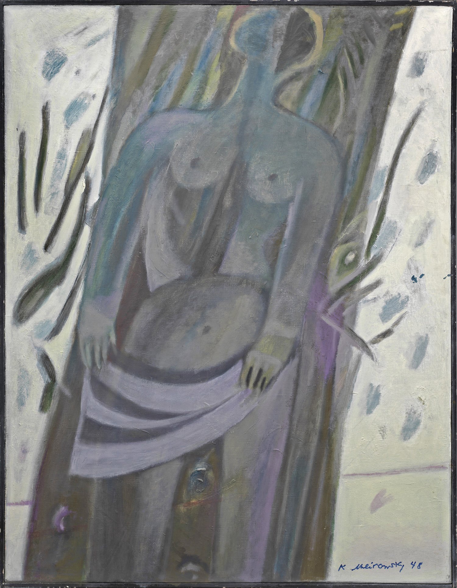 Meirowsky gehörte zur Berliner-Nachkriegs-Avantgarde und war befreundet mit Alexander Camaro, Werner Heldt und Heinz Trökes. 1953-2000 war sie auf Ibiza ansässig. Öl/Lwd.; R. u. sign. u. dat. (19)48. Verso nochmals sign., dat. u. bez. mit Ortsangabe "IBIZA SAN ANTONIO ABAD", Etikett der Großen Kunstausstellung, Haus der Kunst, München 1968. 120 cm x 94 cm. Rahmen-/Atelierleiste.