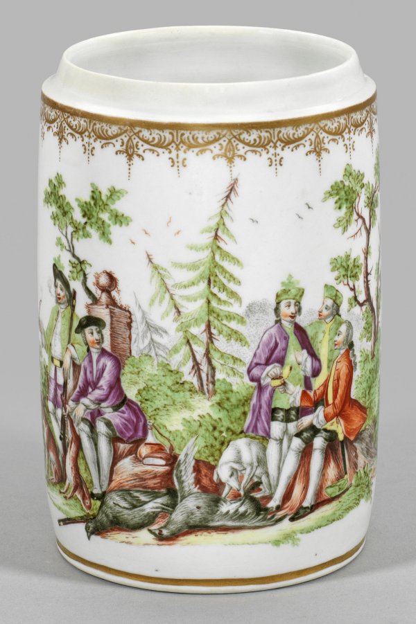 Jagdlicher Humpen mit Hausmalerei-Szene Zylinderförmiger Korpus, seitlicher Bandhenkel mit reliefiertem Akanthusansatz. Auf der Schauseite großzügig angelegte, szenische Darstellung einer Jagdgesellschaft bei der Rast in baumbestandener Landschaft, umgeben von der erlegten Beute. Im Hintergrund emporragende Burgfelsen. Polychrome Malerei wohl von Franz Ferdinand Mayer in Preßnitz.