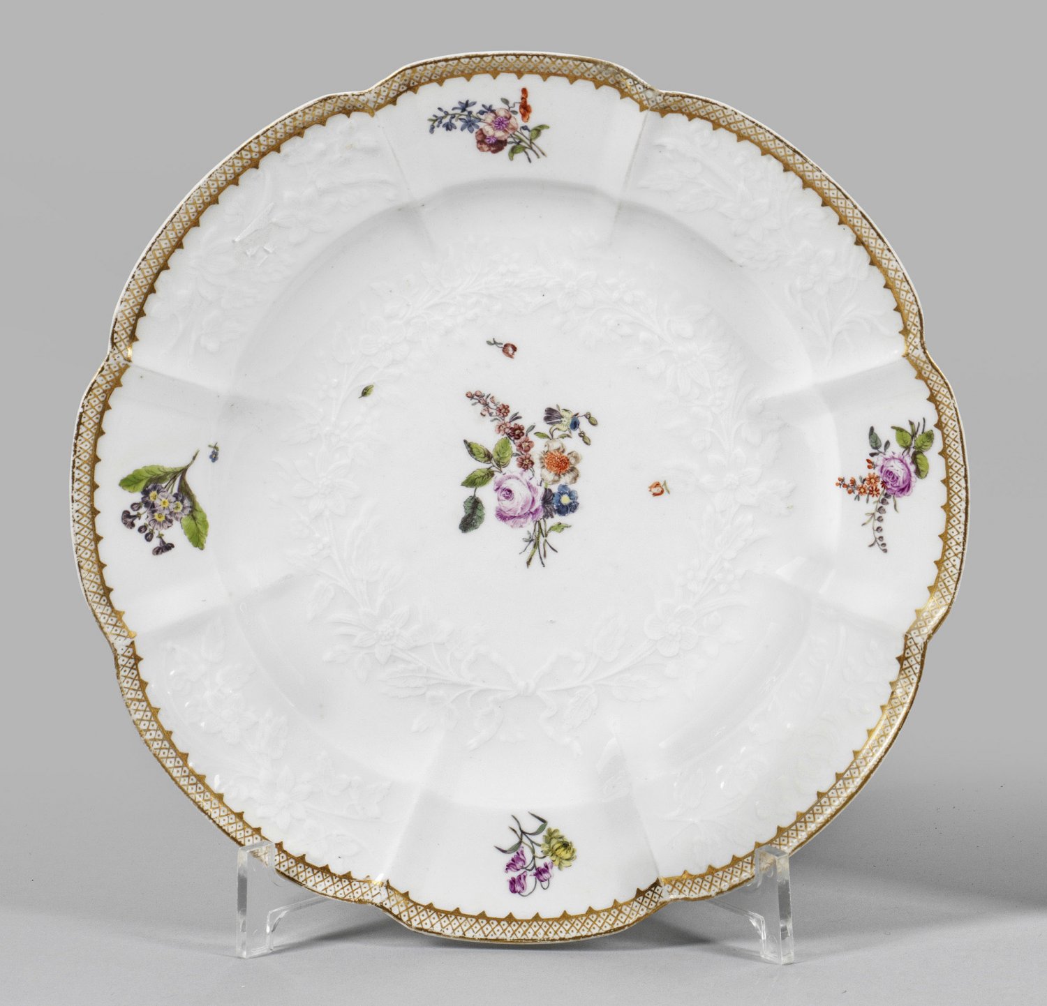 A porcelain "Gotzkowsky" pattern relief plate painted with flowers. Crossed swords mark.