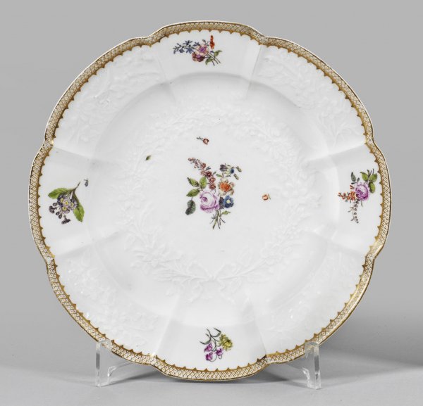 Zierteller mit Gotzkowsky-Relief und Manierblumen Achtpassig geschweifter Rand mit goldener Gitterrandbordüre. Reliefdekor "Gotzkowsky". Im leicht vertieftem Spiegel und auf der Fahne feines Blumengebinde und gestreute Blumen in polychromer Malerei. Schwertermarke. D. 24,5 cm.