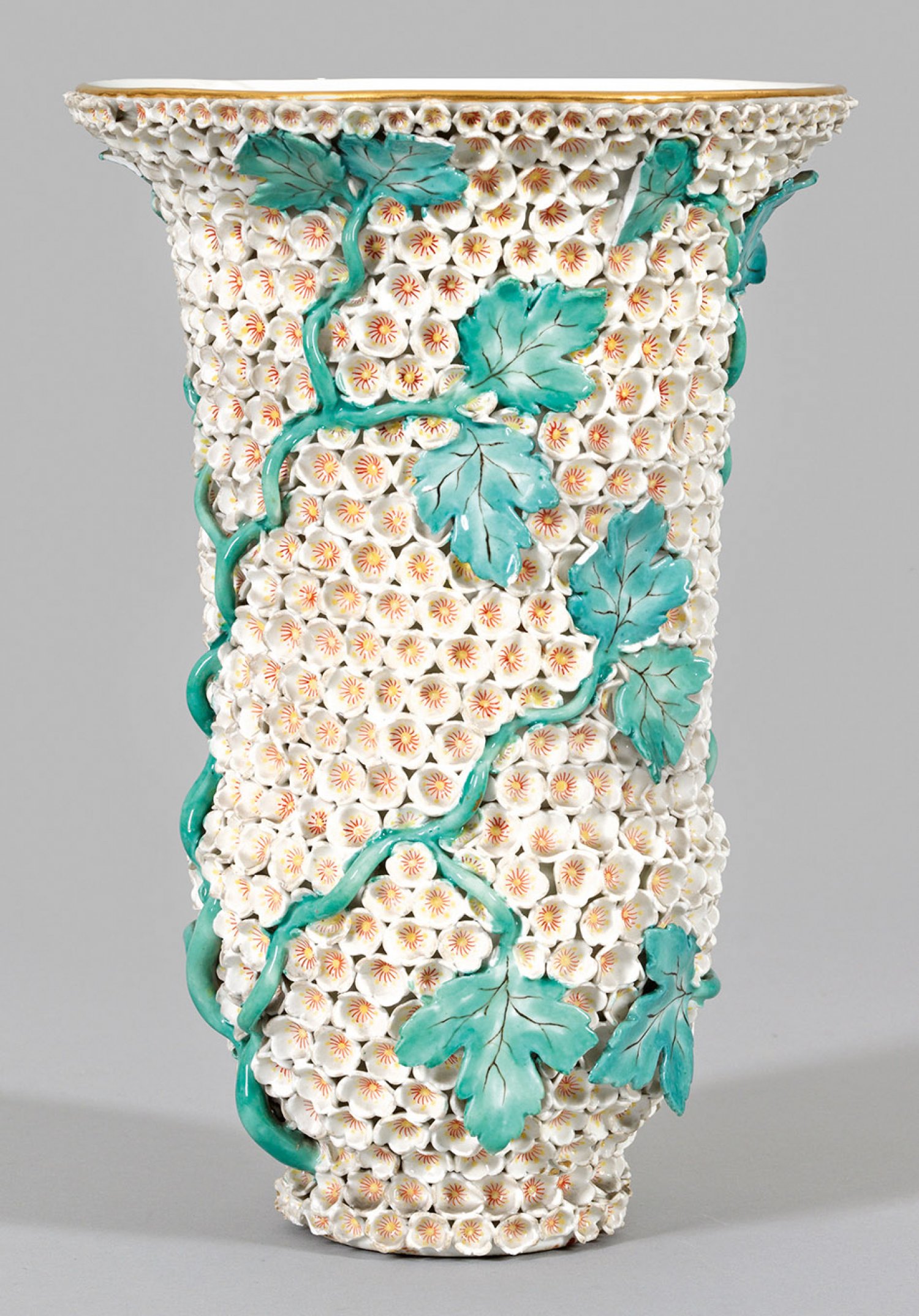 Ziervase mit Schneeballendekor Trompetenförmiger Korpus mit ausschwingendem Rand. Auf der Wandung dichter Fond aus kleinen, weißen, gelb-rot staffierten, aufbossierten Blüten, umzogen von großen, reliefplastisch gearbeiteten Weinlaubranken. Polychrome Malerei mit Goldrand. Minim. best.; Schwertermarke. H. 25 cm.
