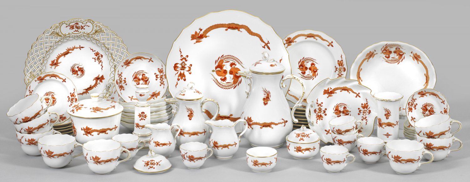 Kaffee- und Mokkaservice mit Dekor "Roter reicher Drache" für 6 bzw. 8 Personen. 41-tlg.; Kaffee-, Mokkakanne, 2 Zuckerdosen, 2 Sahnegießer, 8 Kaffeetassen mit Untertassen, 6 Mokkatassen mit Untertassen, 8 Kuchen-, 6 Konfekt- und ein Gebäckteller, Tortenplatte, 2 Gebäckschalen, Bonbonniere, Vase, Kerzenleuchter. Teilw. mit durchbrochen gearbeiteter Fahne. Dekor "Roter reicher Drache" mit zwei kreisförmig angeordneten Phönixen, gerahmt von zwei chinesischen Drachen sowie Arrangements aus buddhistischen Symbolen in eisenroter, goldgehöhter Camaieumalerei. Teilw. minim. best.; Schwertermarke. Kannen-H. 22 cm. Tortenplatten-D. 32 cm.