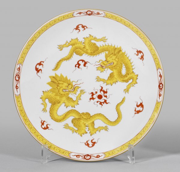 Zierteller mit Dekor "Gelber Mingdrache" Runde, leicht vertiefte Form. Im Spiegel farbiges Motiv aus zwei, eine geflammte Perle umringenden, vierklauigen Drachen nach ostasiatischem Vorbild. Umlaufende Bordüre aus stilisierten Wolken. Polychrome Malerei mit Goldrand. Schwertermarke. D. 25 cm.