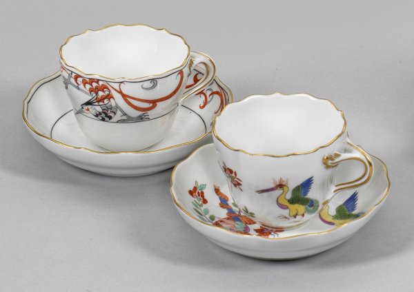 Zwei Mokkatassen mit Untertassen. Farbiger Dekor "Feuervogel" sowie "Chinesischer Drache und Storch" in feiner polychromer, teilw. goldgehöhter Malerei. Goldrand. Schwertermarke. H. 5 cm.