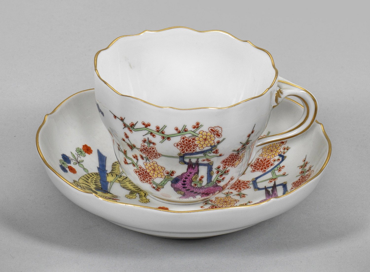 Kaffeetasse mit Dekor "Gelber Tiger" auf Untertasse. Dekor "Gelber Tiger" (auch "Gelber Löwe") nach ostasiatischem Vorbild. Feine polychrome Malerei. Goldrand. Schwertermarke. H. 6,5 cm.