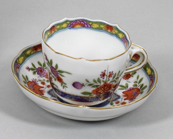 Mokkatasse mit "Famille verte"-Dekor auf Untertasse. Farbenprächtiger Dekor aus stilisierten Päonien- und Chrysanthemenblüten. Unterglasurblaue und polychrome Malerei. Goldornamentik. Schwertermarke. H. 5 cm.