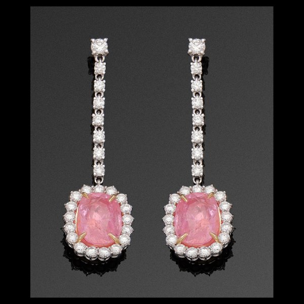 A pair of earrings set with natural pink sapphires (no indication of thermal treatment) approx. 4,74 ct. and 4,34 ct. and diamonds approx. 1,85 ct., in 18 k white gold. Certificates included.