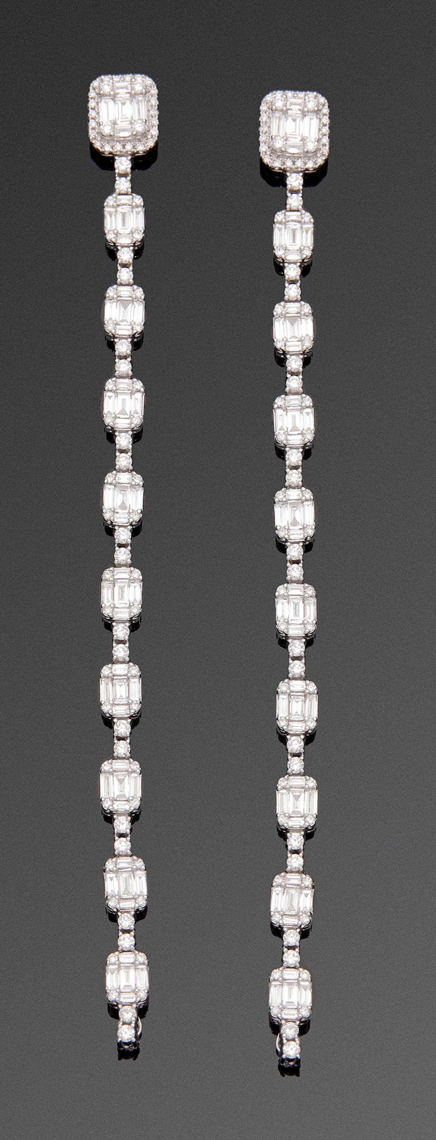 Weißgold, gest. 750. Schauseitig linear besetzt mit Brillanten und Diamantbaguetten von zus. ca. 3,06 ct. (F/vs1). Als lange Gehänge sowie als Creolen zu tragen. Ges.-Gew. ca. 11,96 g.