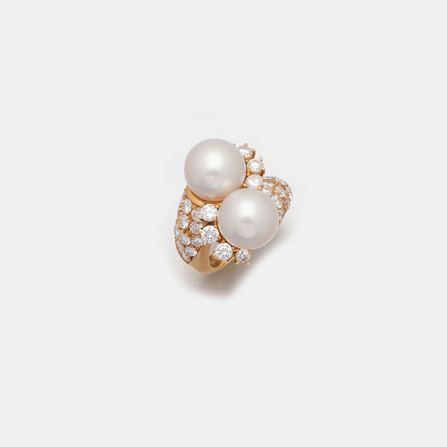 Gelbgold, gest. 750. Diagonal versetzte Ringschiene besetzt mit zwei schneeweißen, nahezu makellosen Südseeperlen von ca. 10 mm in sehr farbintensivem rosé-grün changierendem Lüster, ausgefasst mit Brillanten von zus. ca. 2,40 ct.; Gew. ca. 12,81 g.