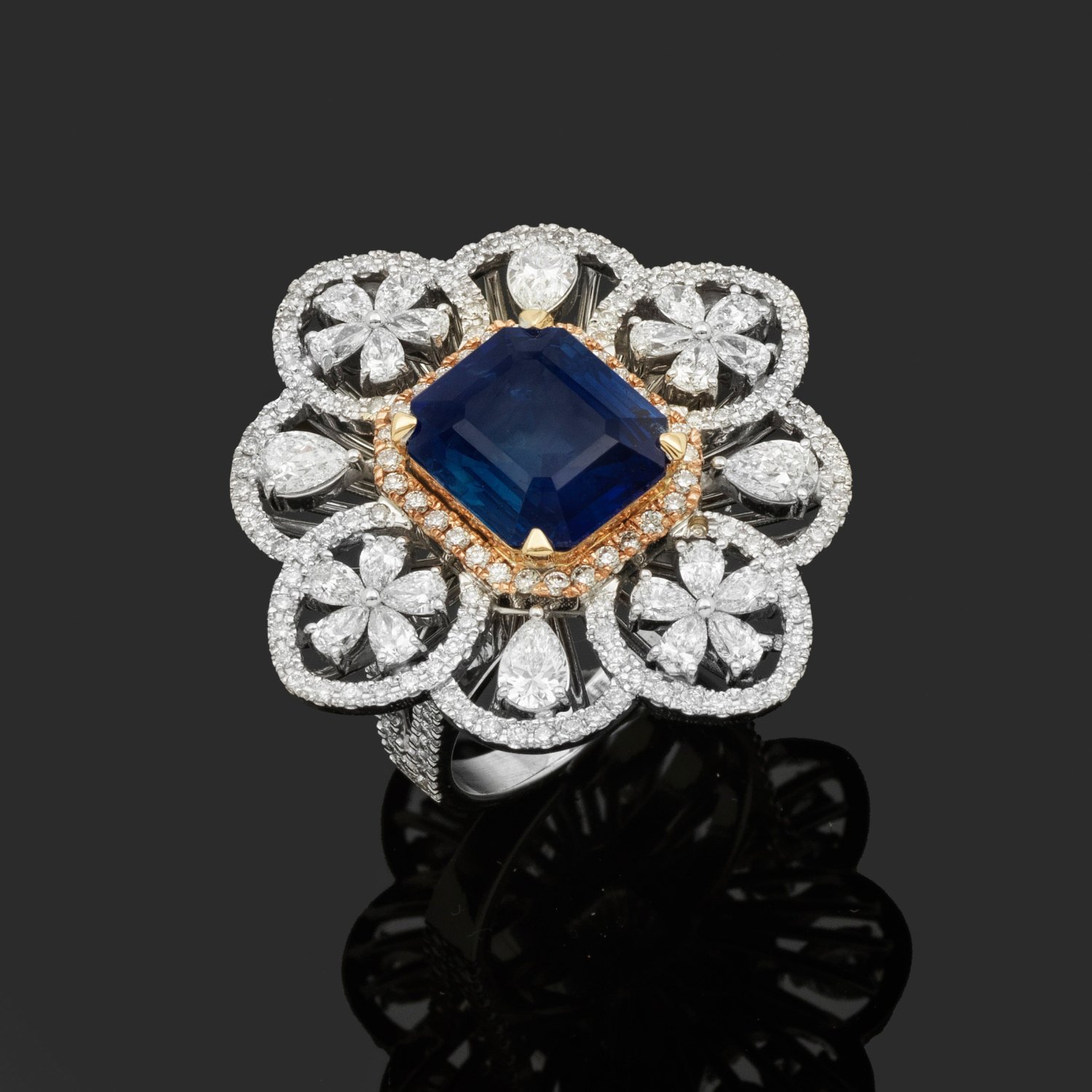 Weißgold, gest. 750. Zentral besetzt mit einem unbehandeltem Saphir von ca. 6,55 ct. im oktagonalem Schliff, medaillonförmige Rahmung in Ajour, besetzt mit Diamanten im Pearcut sowie kleine Brillanten von zus. ca. 3,04 ct. (G/vs). Gew. ca. 17,88 g. Beiliegend GRS-Report, Nr. 2022-068589.