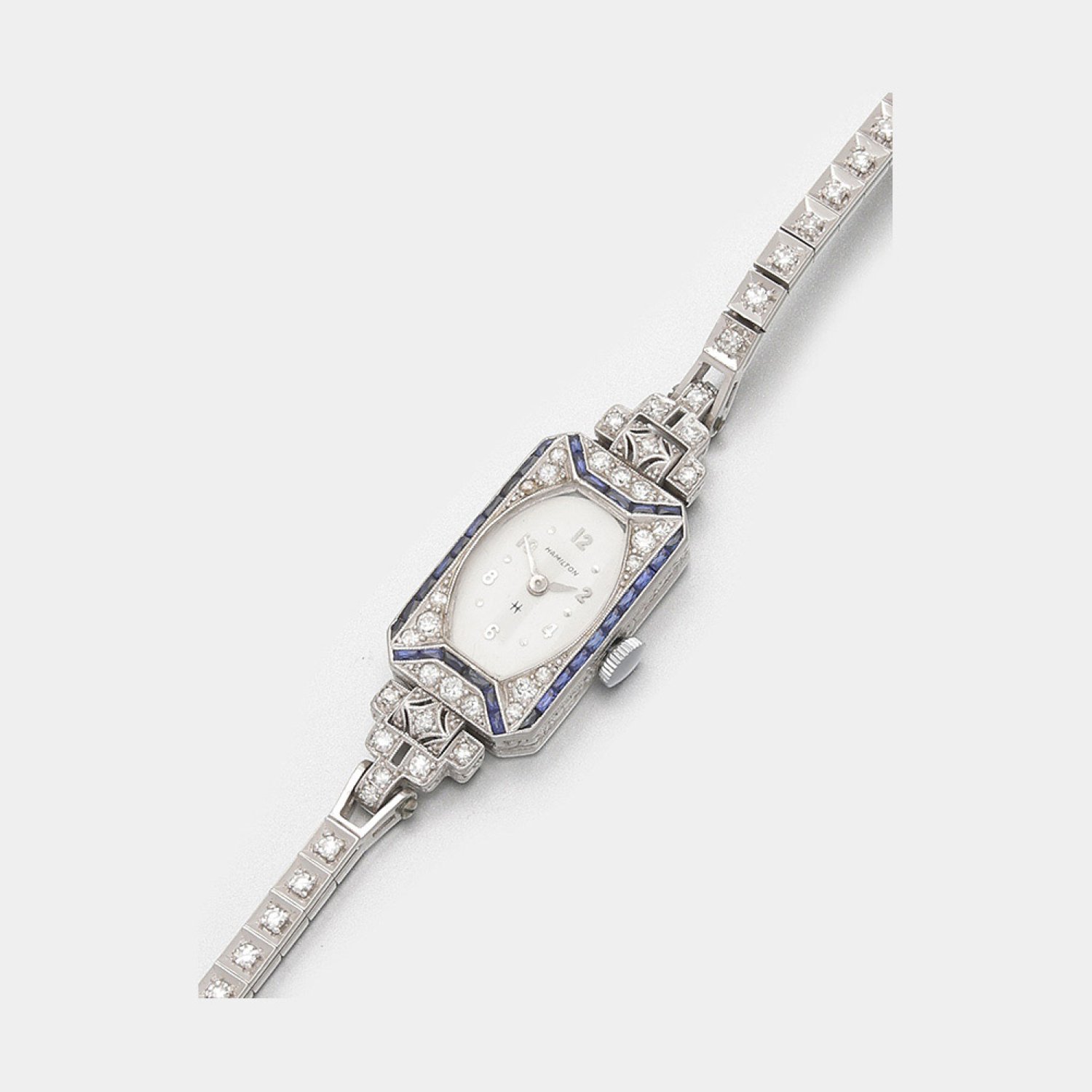 Lady's wristwatch by Hamilton, set with diamonds and sapphires, in 14 k white gold.
