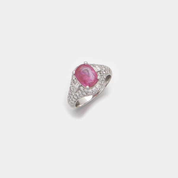 Weißgold, gest. 750. Zentral besetzt mit einem pinkfarbenem unbehandelten Rubin von ca. 3,19 ct., ausgefasst mit Diamanten von zus. ca. 1,36 ct.; Gew. ca. 5,92 g.